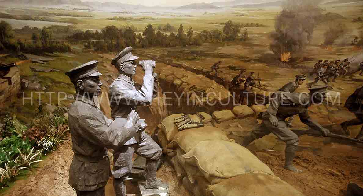設計說明:畫面內容表現的是石龍人民支持孫中山領導的革命軍隊對叛軍陳炯明的征討,并擊潰叛逆軍的場景,布局依次為石龍人民對東征軍的物質支持,以及對傷員的救護,依次周恩來進行演講宣言,飛鵝嶺上孫中山指揮炮擊叛軍,戰場前線指揮的蔣介石,向前沖鋒的士兵,彌漫的硝煙,竹梯攻城的場景,結合鐵絲網,戰壕沙袋等道具以及各種廢墟和強烈的爆炸場面,加強渲染了戰爭氣氛,突出了石龍人民對革命的支持以及孫中山領導的革命軍的英勇。