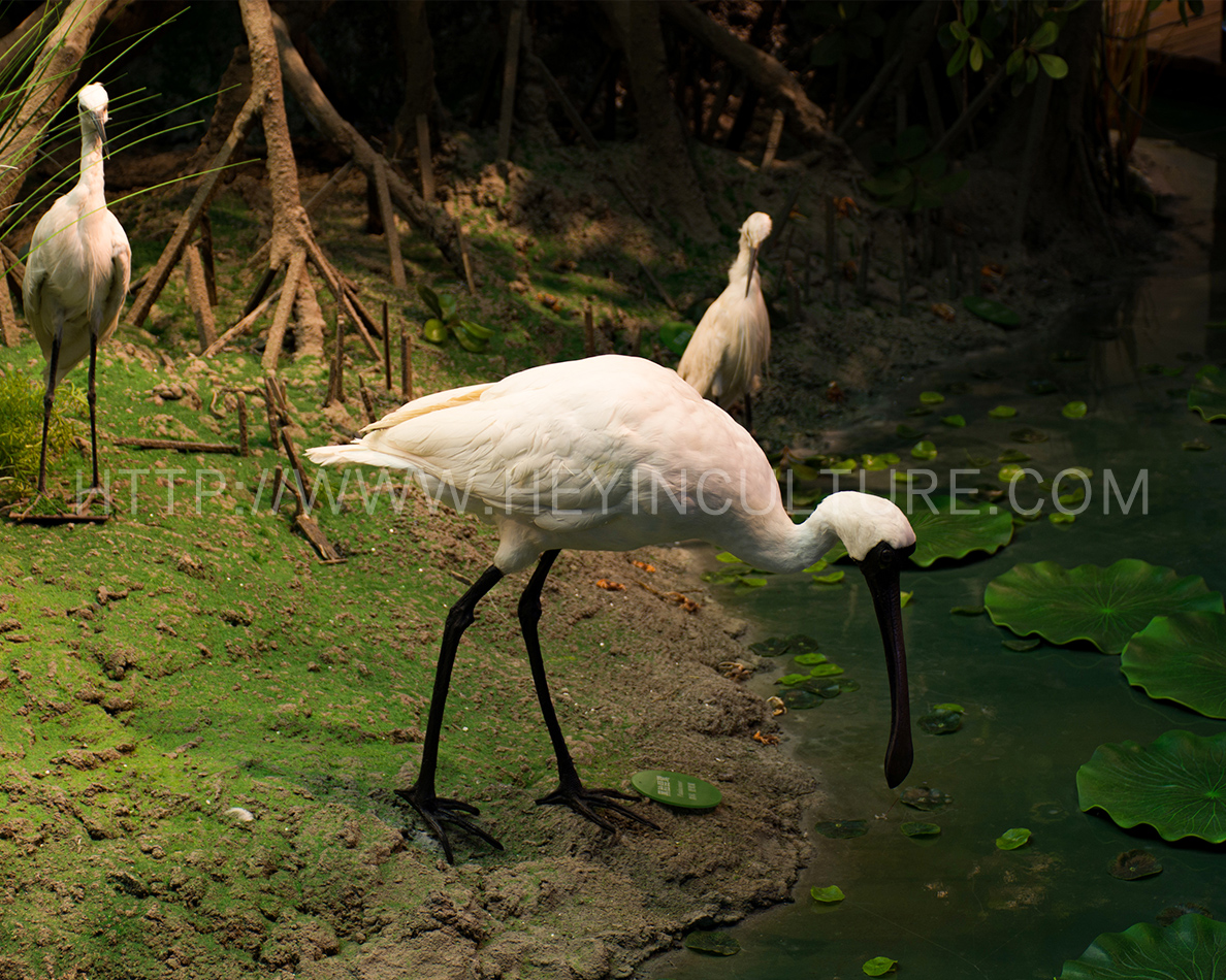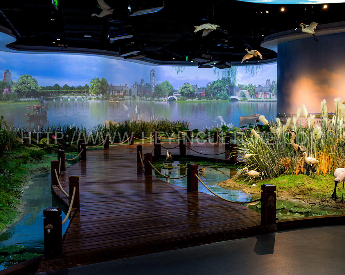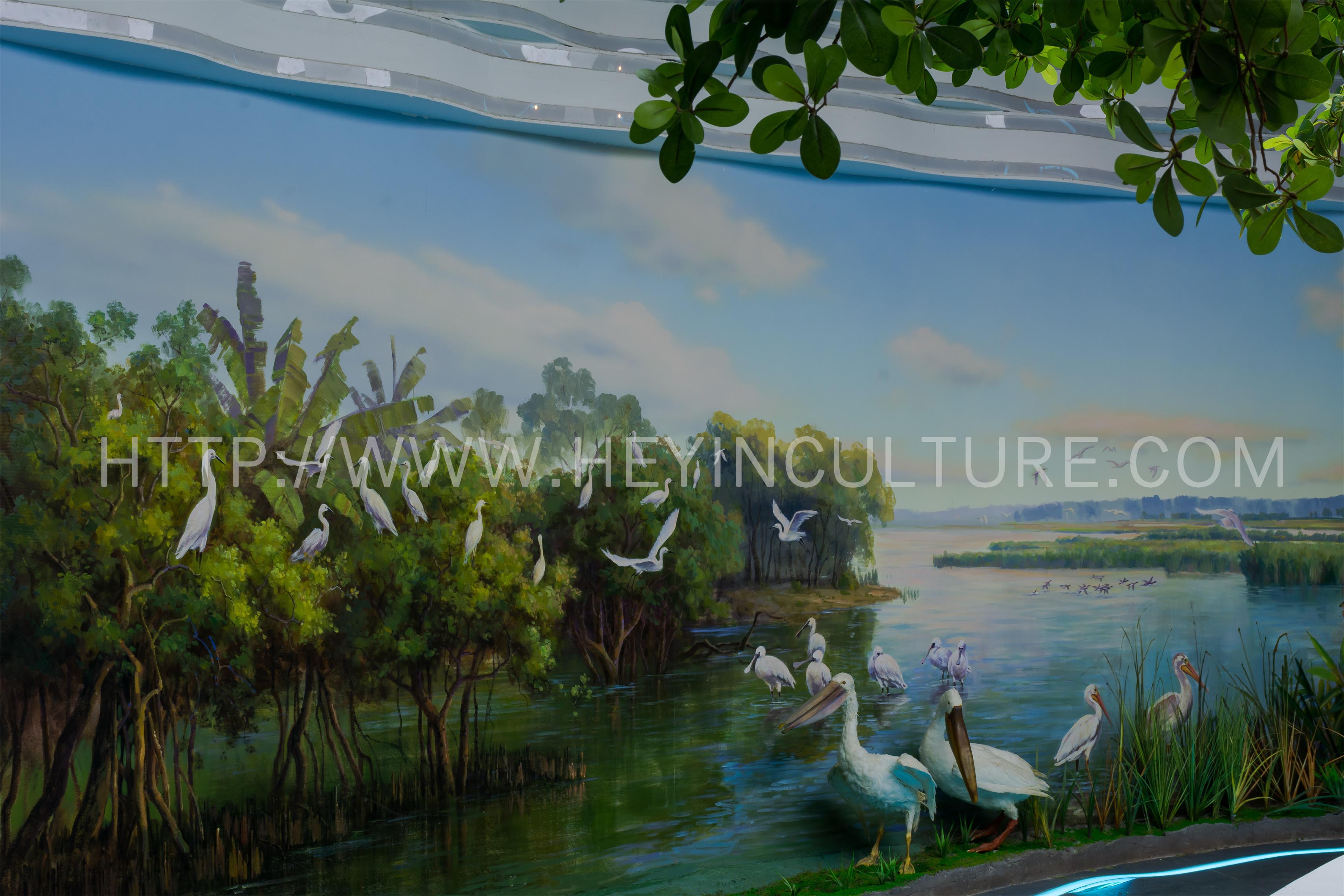 設計說明:通過仿真動物、植被、樹木、水面造景等組成藝術場景,用藝術手法還原生態園的優良環境,結合現場多媒體、燈光等效果, 營造南沙水鳥世界生態園的美好環境。