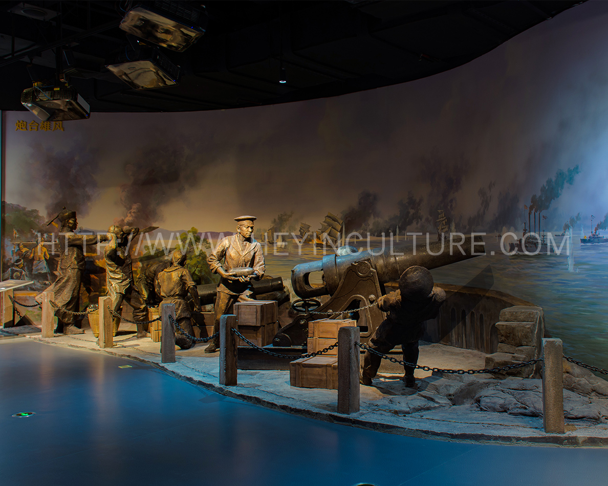 設計說明:南沙炮臺是打響鴉片戰爭第一炮和打響抗日戰爭第一炮的地方,炮臺雄風場景為表現軍隊英勇抗戰、奮力反擊的歷史畫面,運用雕塑,油畫和藝術場景再現 戰爭的激烈和軍隊的英勇。