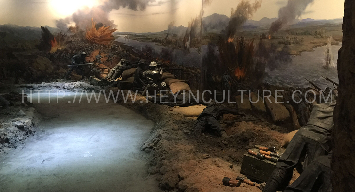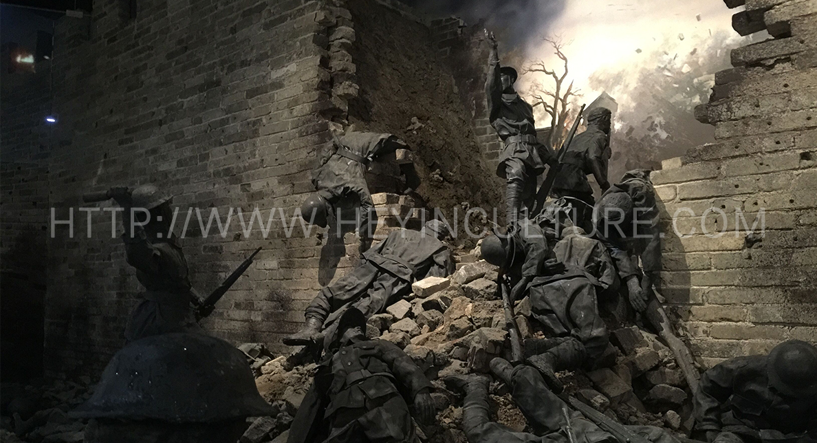 設計說明:破碎的城池,四起的硝煙,堆積如山的尸體,體現了戰(zhàn)爭之慘烈,日軍之兇殘,我軍之英勇,正可謂一寸山河,一寸血,觀眾的參展路線貫穿整個藝術場景,現場戰(zhàn)爭氣氛的強烈代入感,可讓參觀者切身體驗戰(zhàn)爭之殘酷,革命之艱辛。