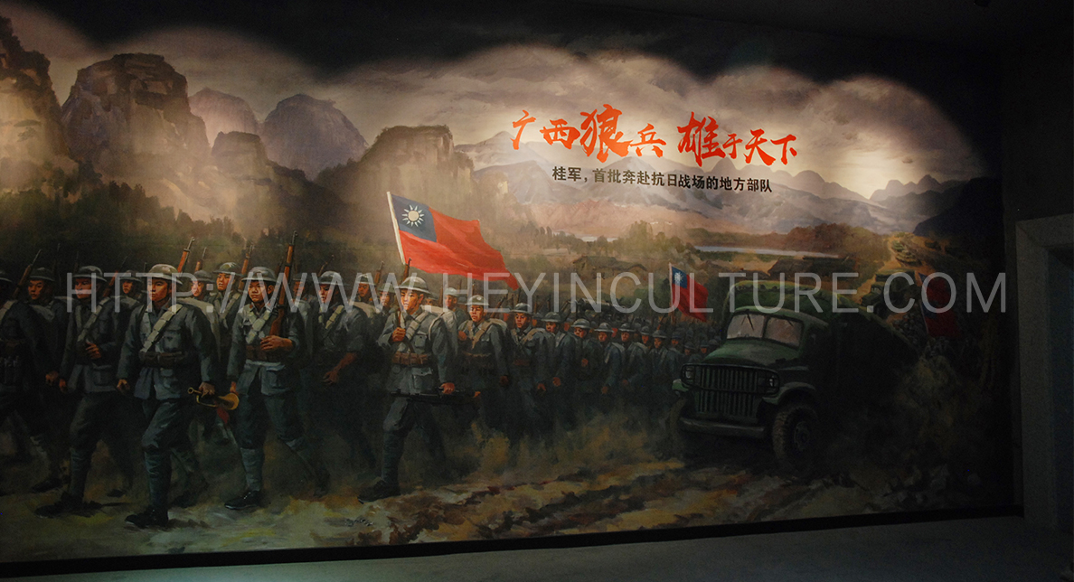 設計說明:桂軍雄赳赳,氣昂昂出關北山抗日,奔赴戰(zhàn)爭英勇殺敵之情景。