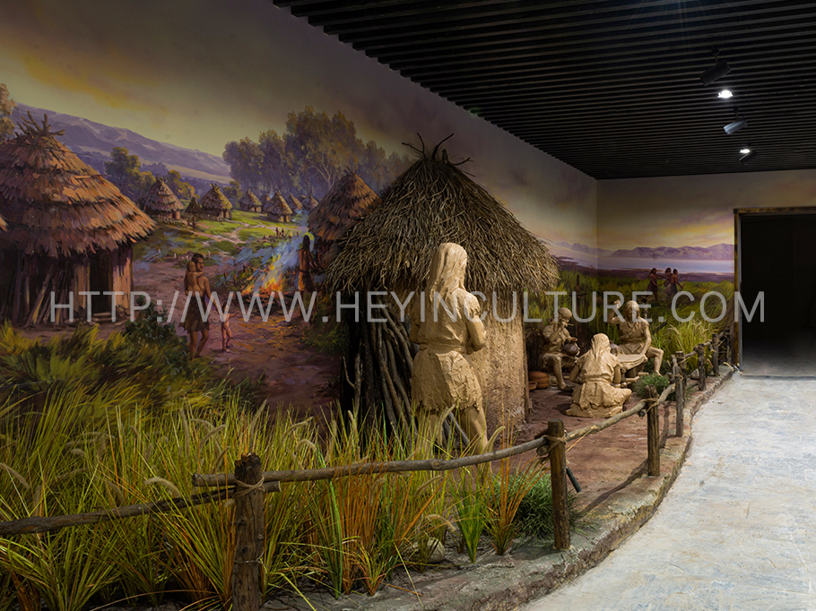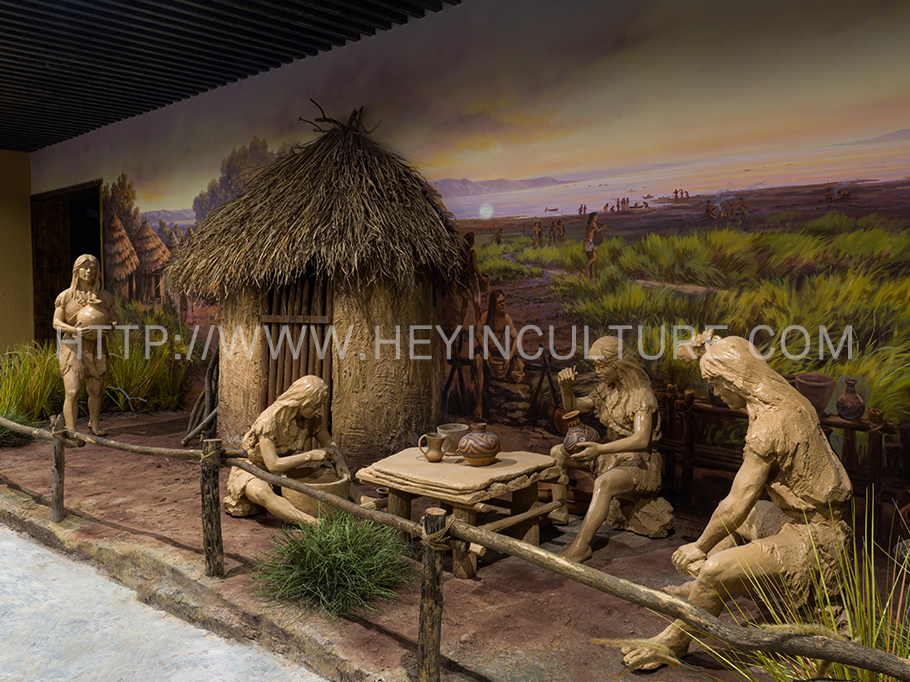 設計說明:生動的復原造景,呈現新石器時代先民在此生息繁衍的場景他們使用打制或磨制的石器從事生產勞動,并學會了制造粗糙的陶器以滿足自己的日常生活需要。定州地處華北平原氣候濕潤,水草豐美,有沙河、唐河穿境而過,為古人類創造了良好的生存環境。