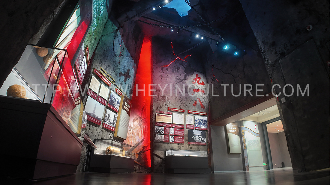 以低沉昏暗的灰色墻面模擬戰爭時期的建筑,給人一種粗糙、破舊的感覺,壓抑沉悶的氛圍下中國人民奮起反抗,激發觀眾的情感共鳴。